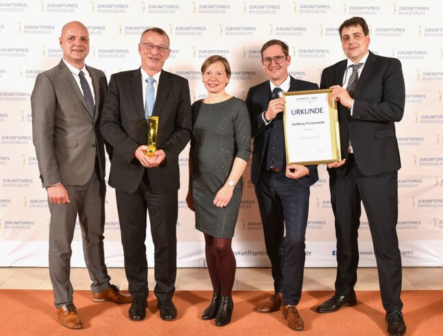 Auf den Tag genau ein Jahr nach der Auszeichnung mit dem Brandenburger Innovationspreis konnten am 12. November Dr. Michael Schnick, Geschäftsführer der Kjellberg-Holding, Volker Krink, Vorstandsvorsitzender der Kjellberg-Stiftung sowie Dr. Jörg Eßmann und Falk Tzschichholz als Geschäftsführung der Kjellberg Finsterwalde Plasma und Maschinen GmbH zusammen mit Ines Lehmann, Leiterin Marketing, den Preis stellvertretend für die gesamte Unternehmensgruppe in Empfang nehmen. „Für uns ist diese Auszeichnung eine Bestätigung unserer nachhaltigen Weiterentwicklung der Traditionsmarke Kjellberg. Unsere Mitarbeiterinnen und Mitarbeiter gestalten Tag für Tag mit Know-how und Engagement erfolgreich die Zukunft unserer Unternehmen – darauf sind wir sehr stolz“, so Dr. Michael Schnick.