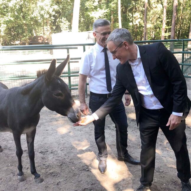 Bei einer offiziellen Begrüßungsrunde haben der Vorstandsvorsitzende der Kjellberg-Stiftung Mathias Fritsche, der Bürgermeister der Sängerstadt Finsterwalde Jörg Gampe und Tierparkleiter Torsten Heitmann endlich die vier neuen Patenkinder der Kjellberg-Stiftung im Finsterwalder Tierpark kennengelernt. Hintergrund ist, dass sich der Bürgermeister zu seinem runden Geburtstag Ende 2019, Spenden für den Tierpark statt Geschenke gewünscht hatte. Und so kam es, dass seither ein europäischer Uhu, ein Nasenbär, ein Storch und ein Esel für vorerst ein Jahr zur Kjellberg-Belegschaft gehören. "Unser Tierpark wird immer schöner, vor allem auch dank des Engagements der Stadt sowie des gesamten Tierpark-Teams. Unsere Unterstützung ist somit weniger ein Geschenk als vielmehr eine Herzensangelegeheit" bestärkt Mathias Fritsche.